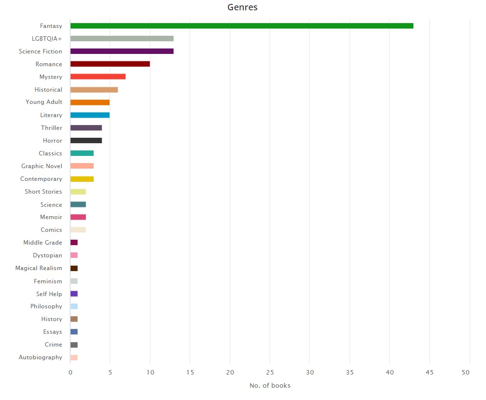 The genre breakdown is among my favorite of the stats. I just love the proof that I read more than just fantasy books. Not much more, mind you, but more. But yes, I did read 43 fantasy books this year. I also read 13 queer rep books, 13 sci-fi, and, in a surprising twist, 10 romance books! How did that last one happen?